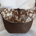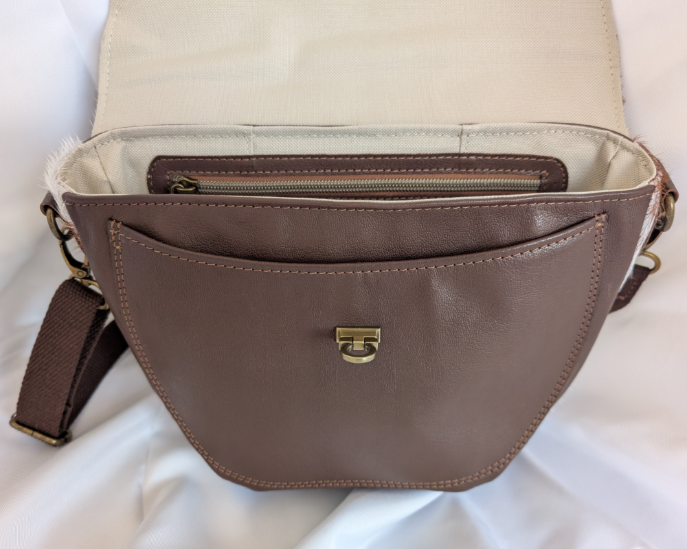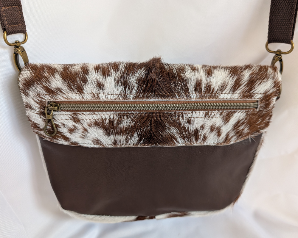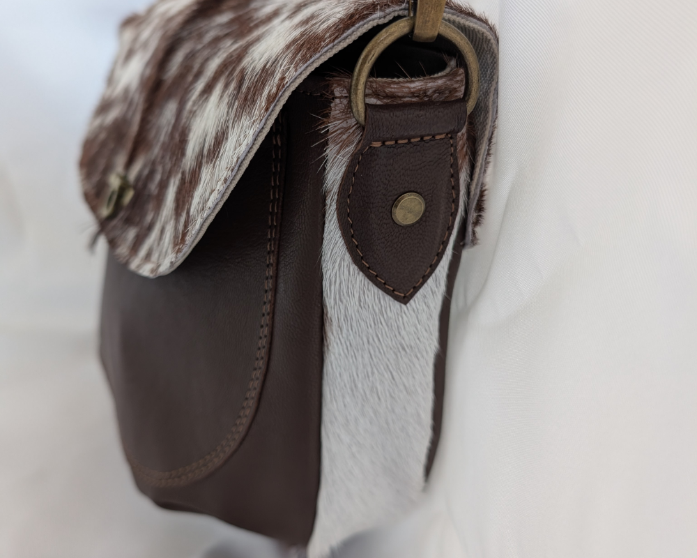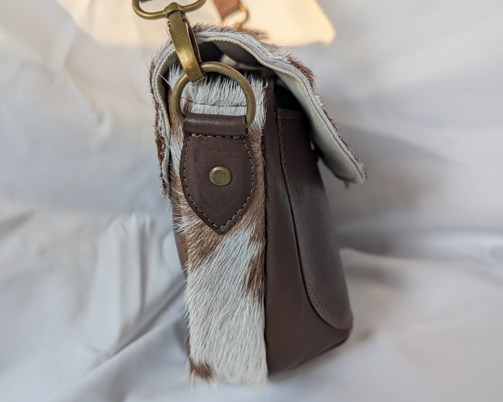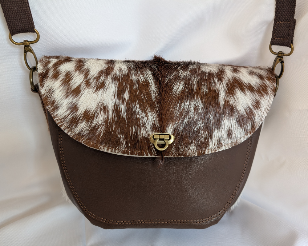 This cute genuine leather bag is perfect for carrying all your essentials. It has a front slip pocket, an inside zipper pocket with credit card slots below, and a zipper pocket on the back of the bag. The hair on hide flap closes with a flip lock. It features antique bronze hardware and is fully lined with durable waterproof canvas. The strap adjusts from 28" to 52". Wear it as a crossbody to have your hands free.