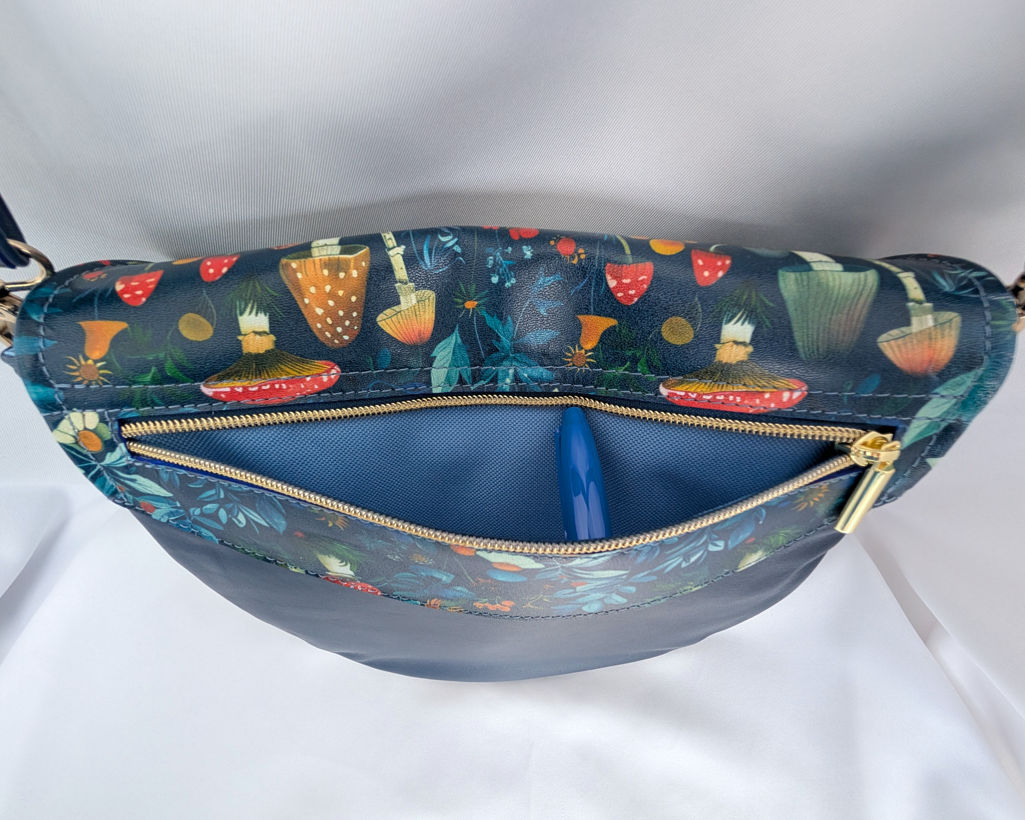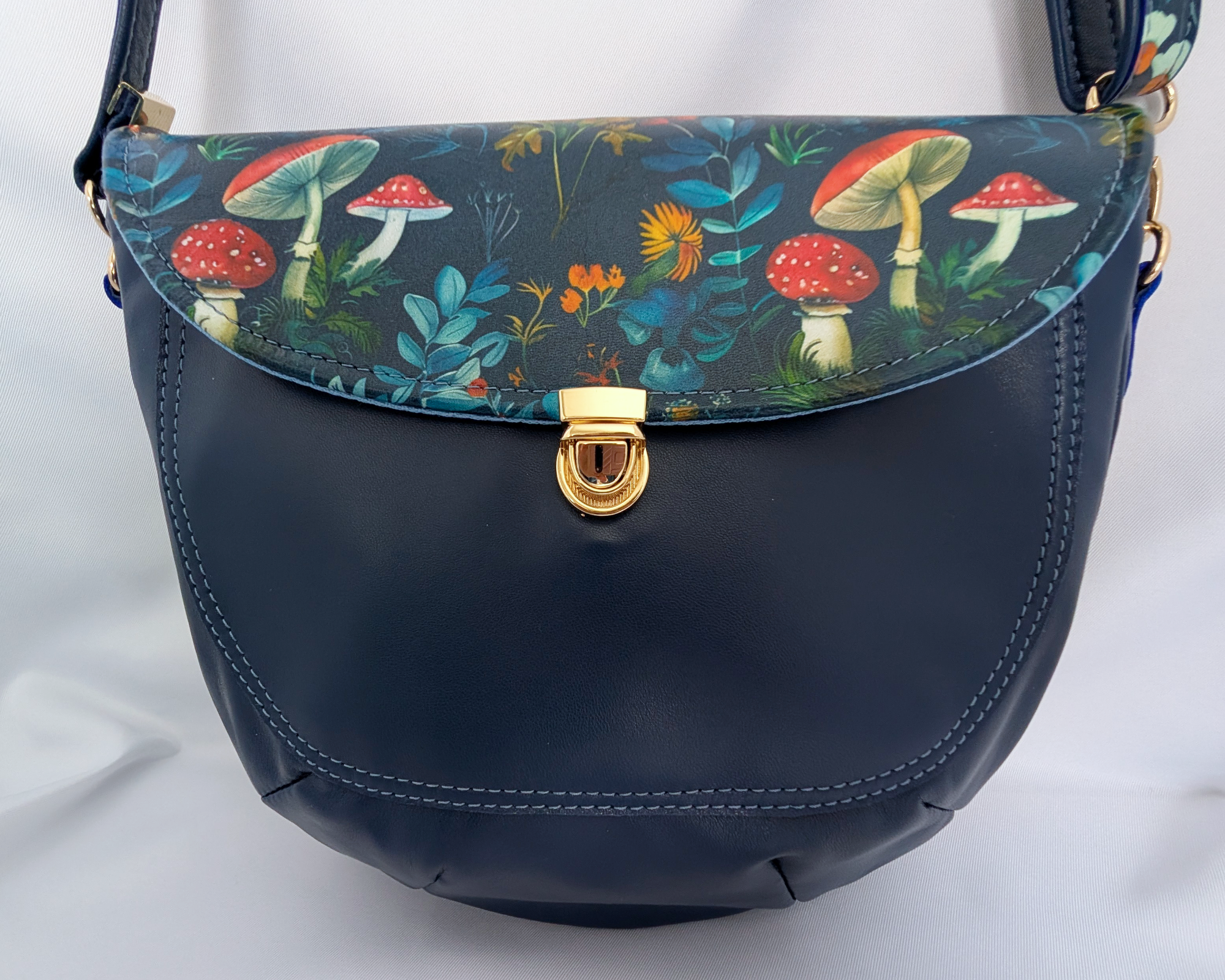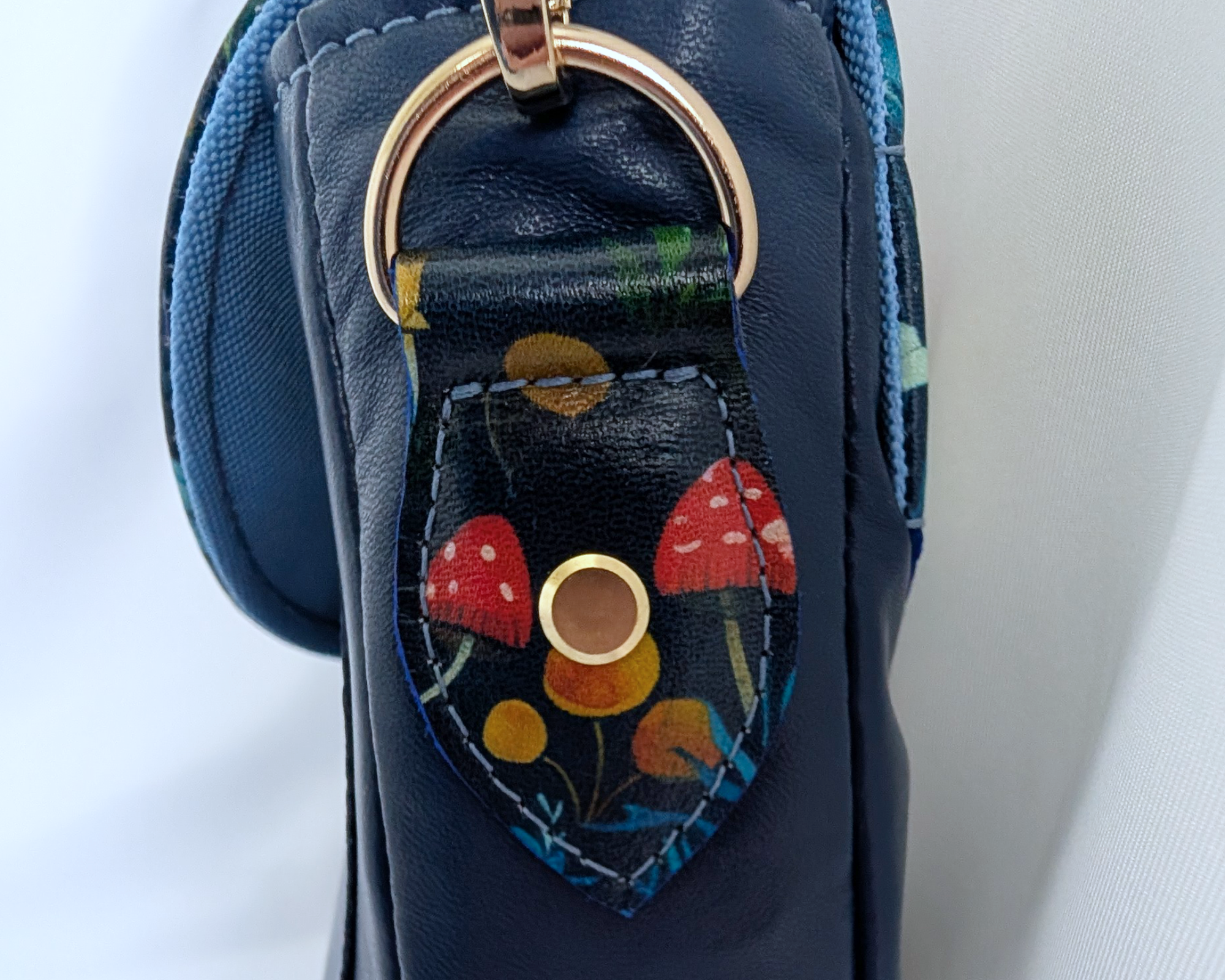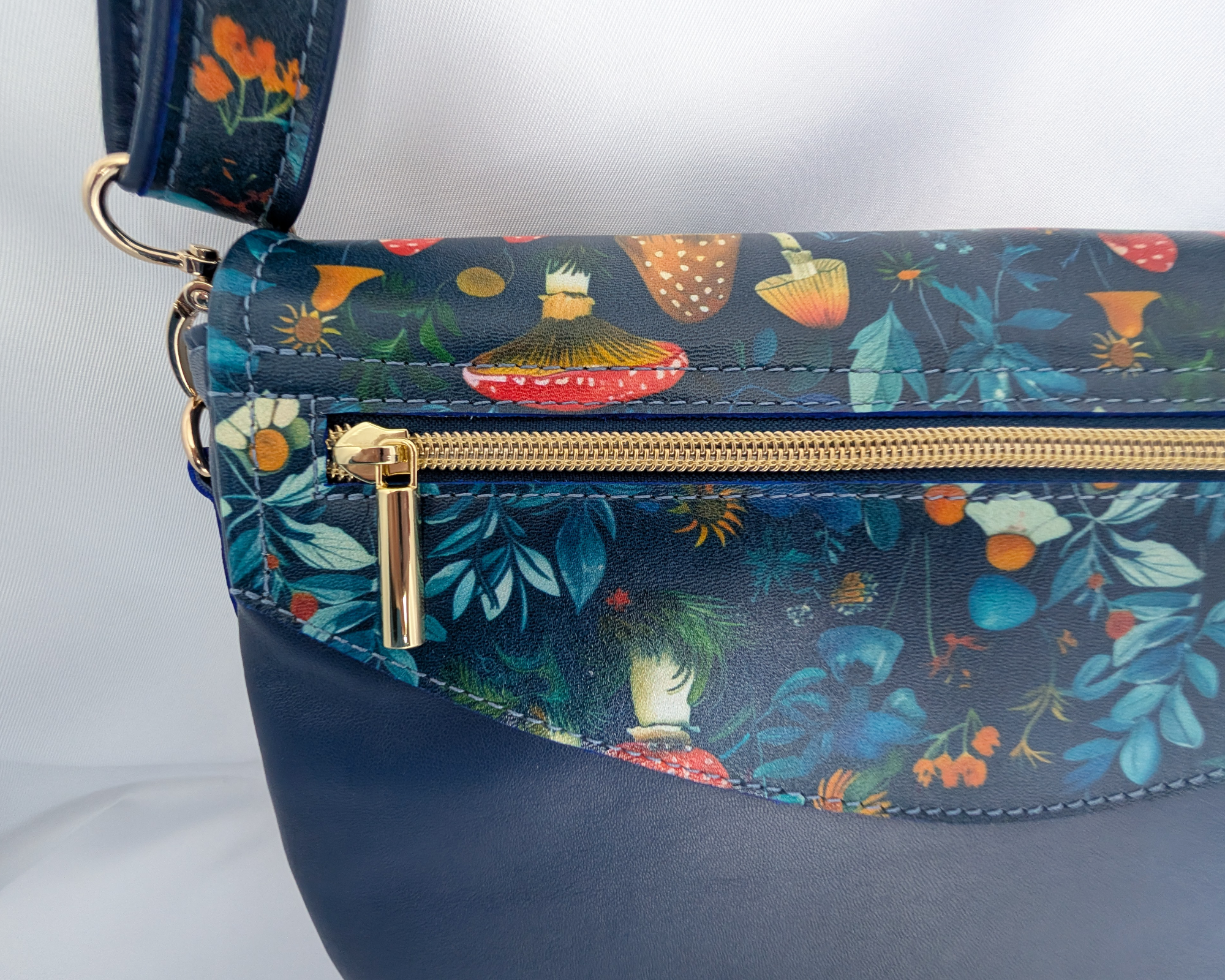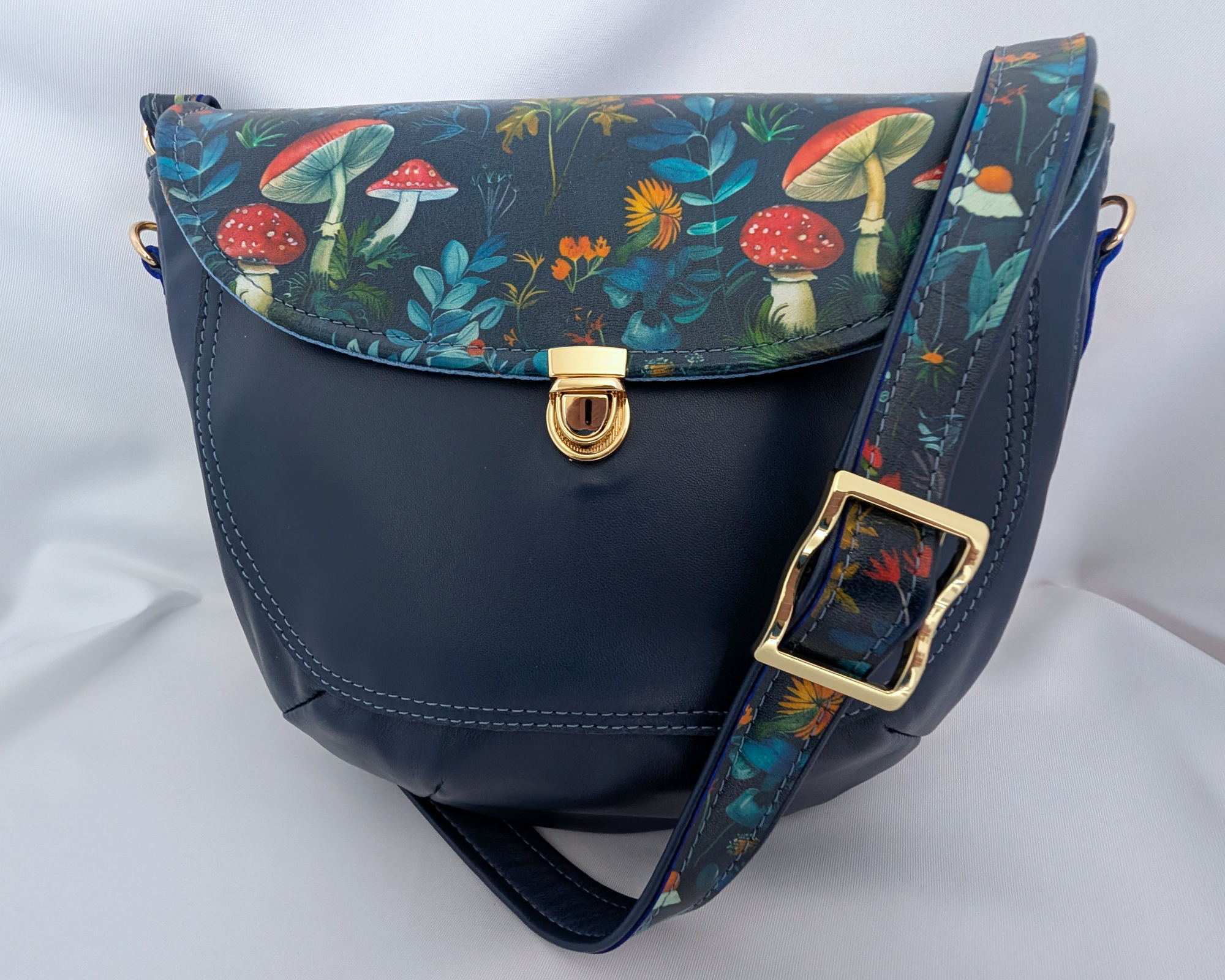 When I saw this mushroom print leather I just had to buy it to make a cute bag. This design is pleated on the bottom to add extra room without being bulky. The mushroom print flap closes with a thumb lock. It features gold hardware and is fully lined with durable waterproof canvas. It features a front slip pocket, a back zipper pocket, an inside zipper pocket and another slip pocket. The strap adjusts from 20" to 37". Wear it as a shoulder bag or a crossbody to have your hands free.