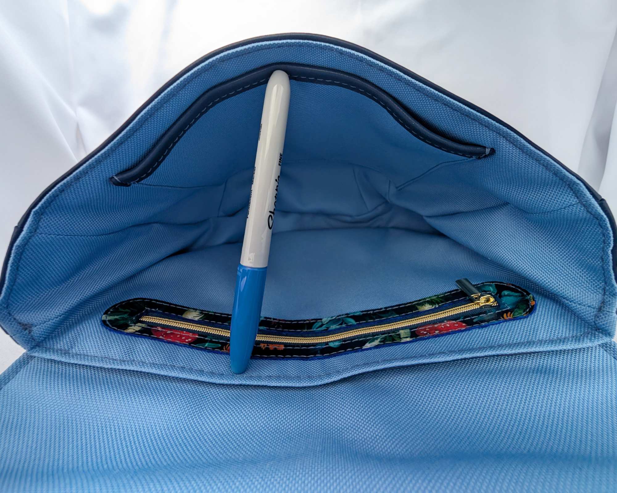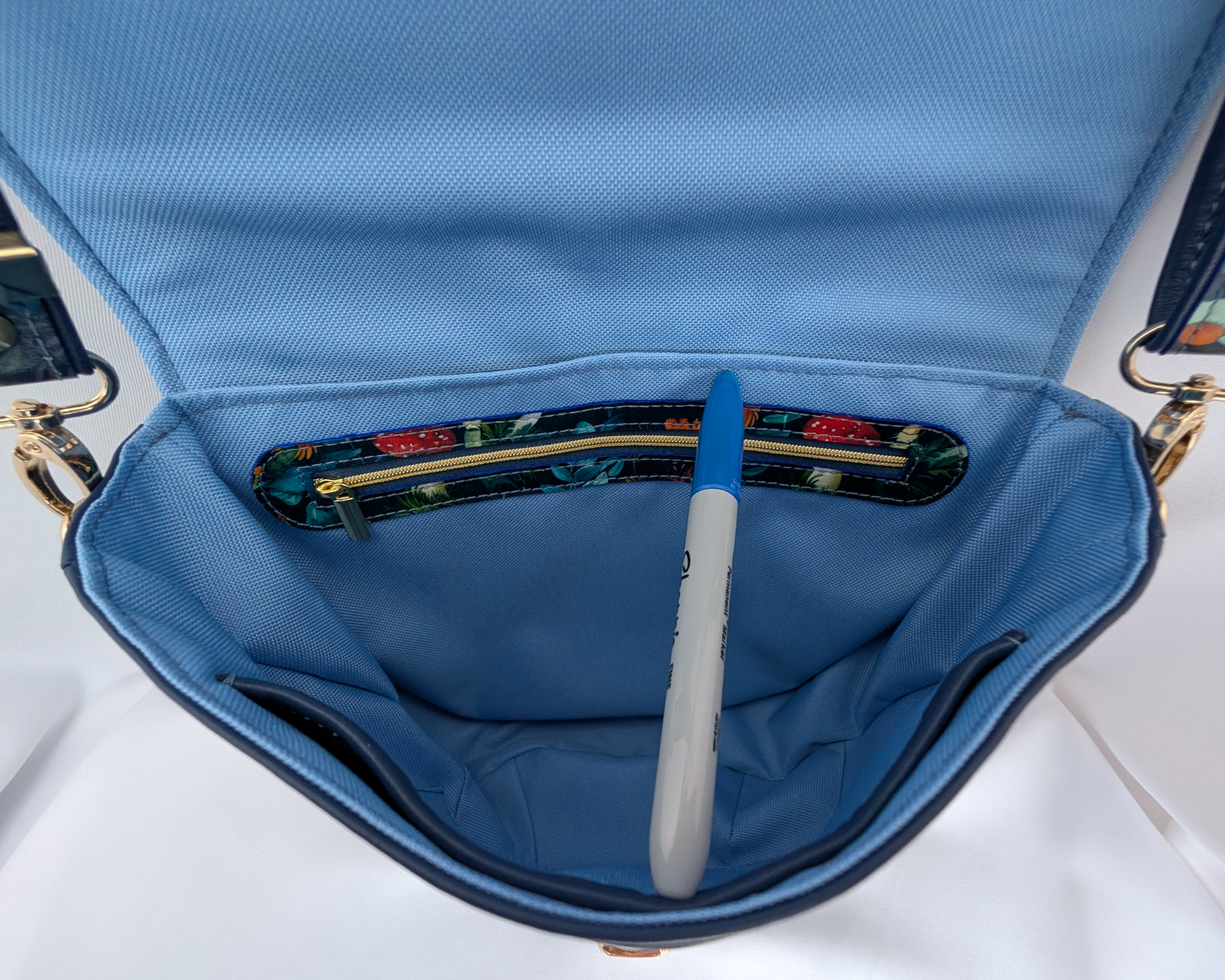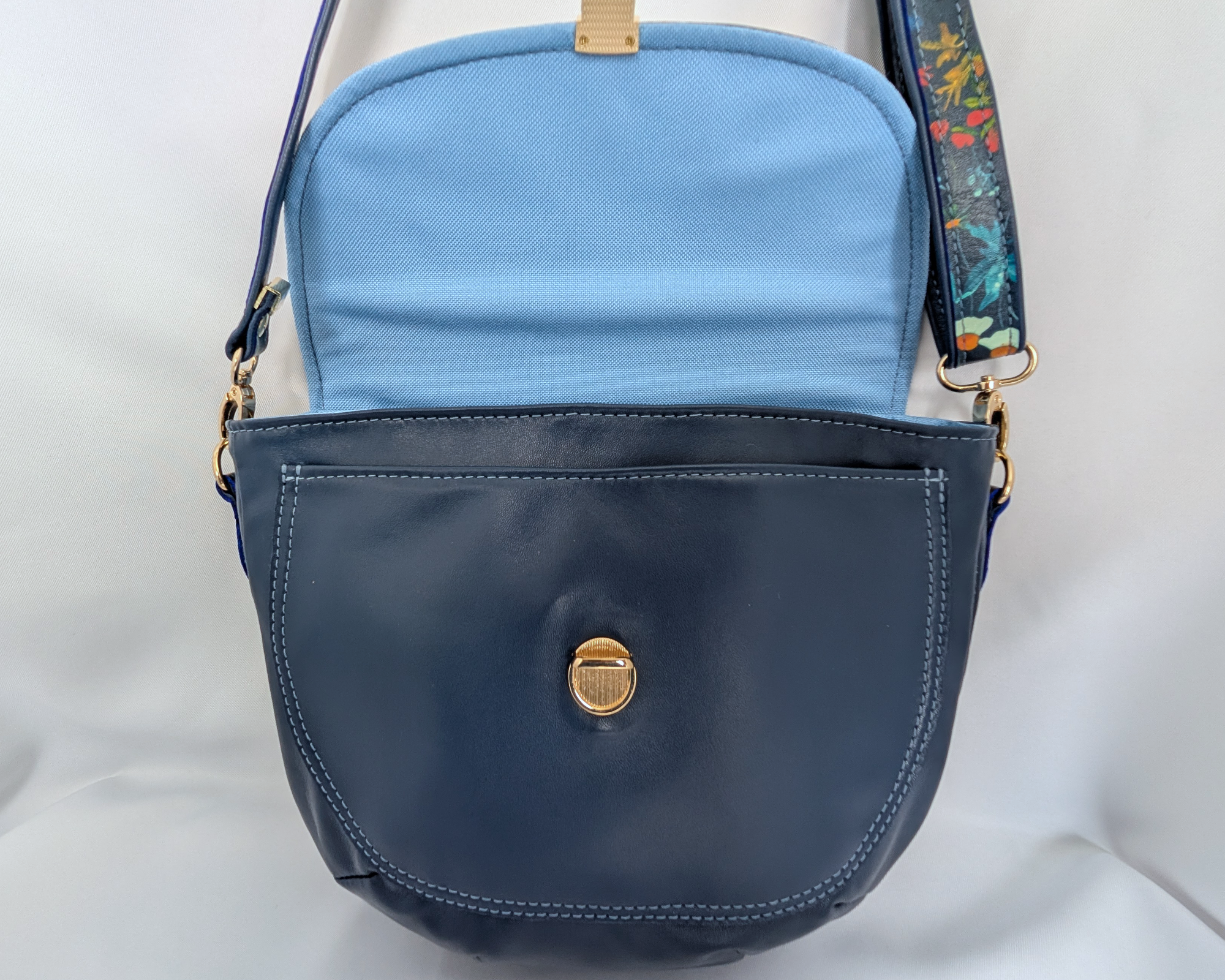 Made from buttery soft blue lambskin and printed cowhide for the flap, this is a one of a kind bag. The leather for this bag was purchased from a small business that sources leather from some of the best tanneries in Italy and other countries. All my bags are sewn on an industrial sewing machine.