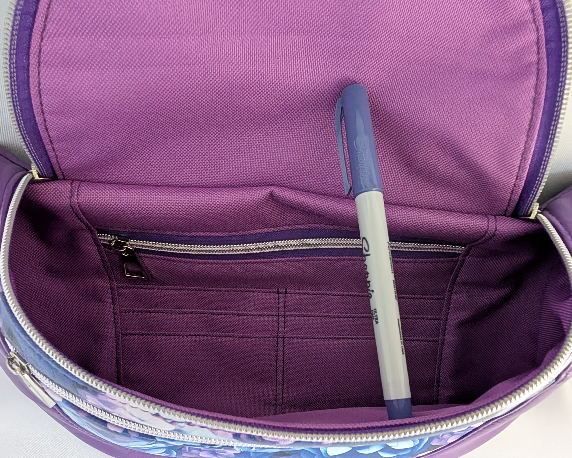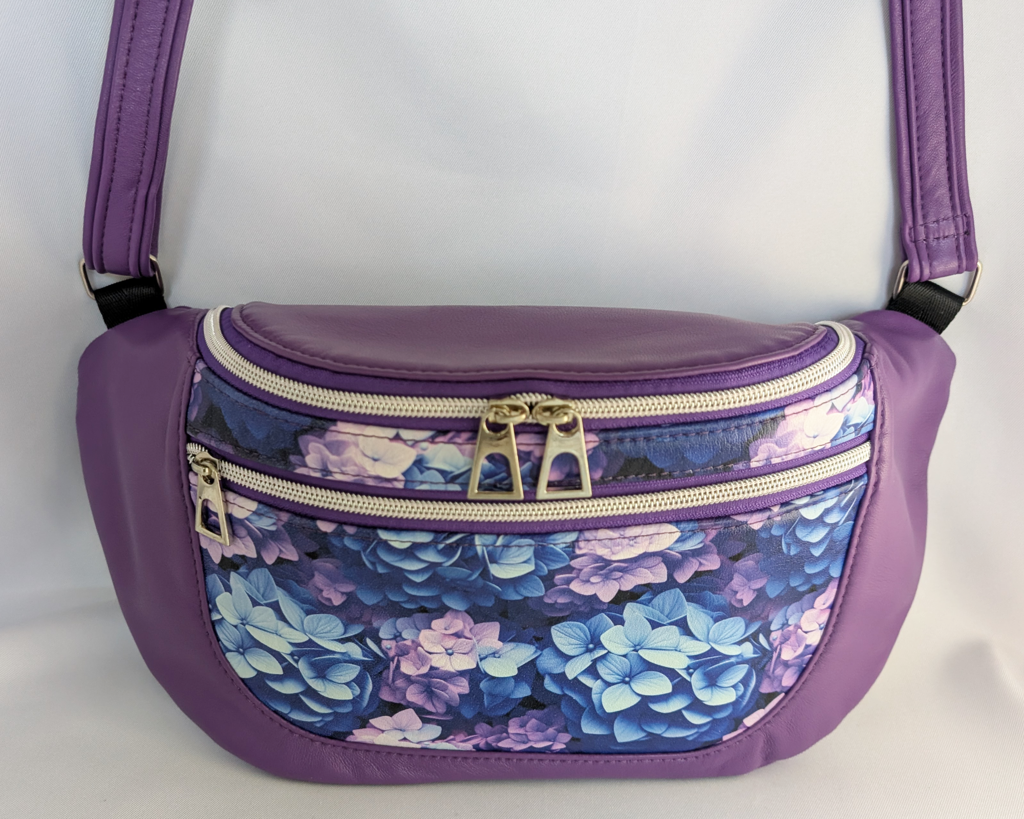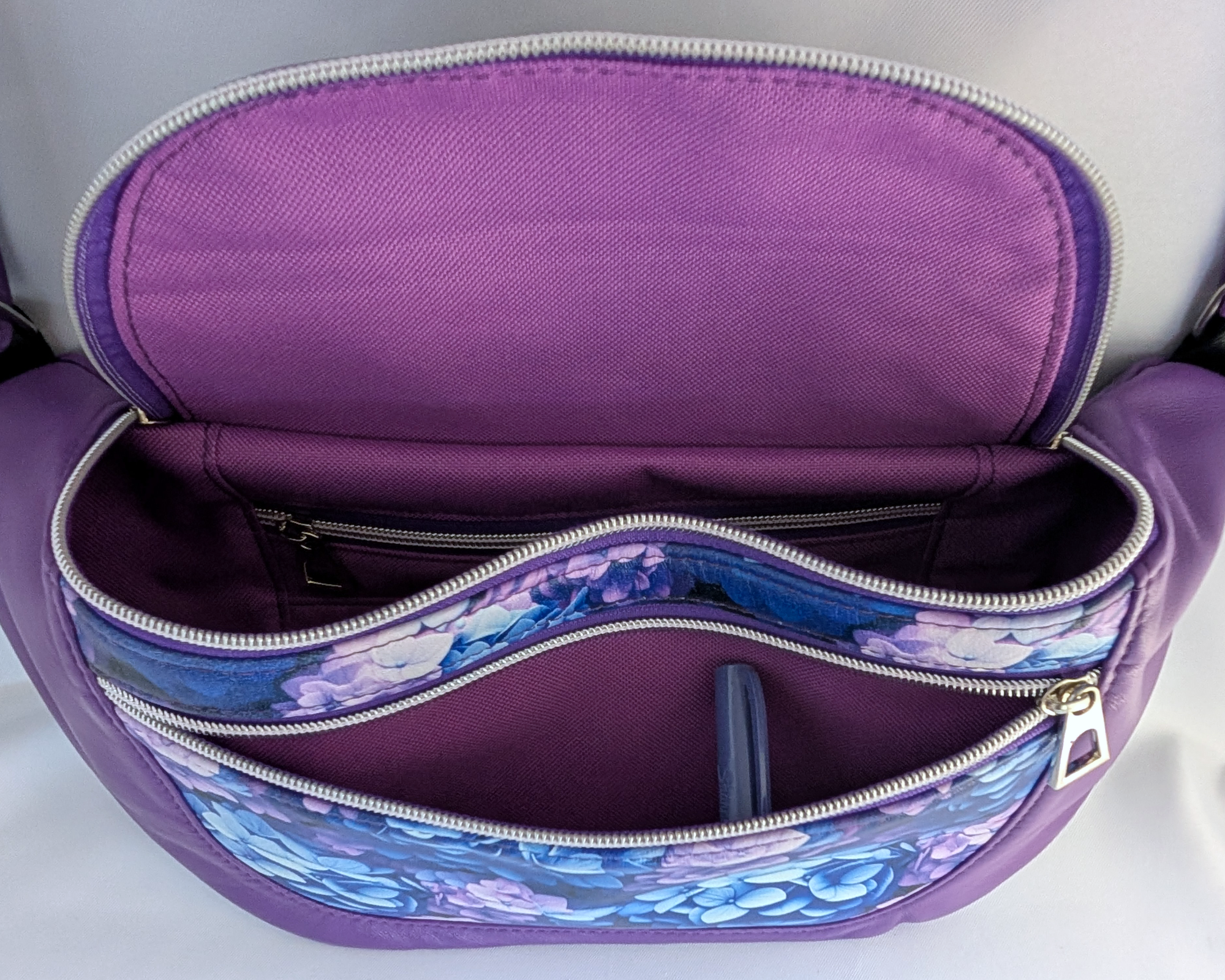 Soft, supple leather and a beautiful Hydrangea print on the the front pocket make this bag special. Inside, there are six credit cards slots with a zipper pocket above and plenty of room for a wallet, keys, and other valuables. On the back is another large zipper pocket. The matching leather strap adjusts from 34" to 46". Wear it as a crossbody to have your hands free. The bag measures 14" wide by 8" tall and 4.5" deep at it's widest point. It's fully lined with durable waterproof canvas and has silver hardware.
